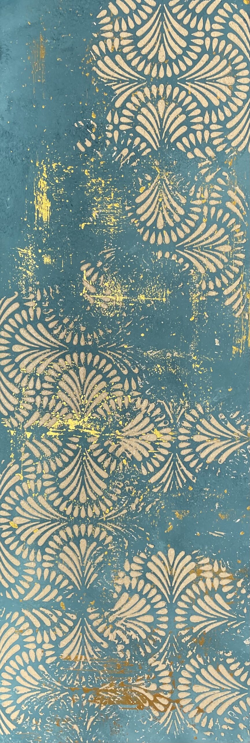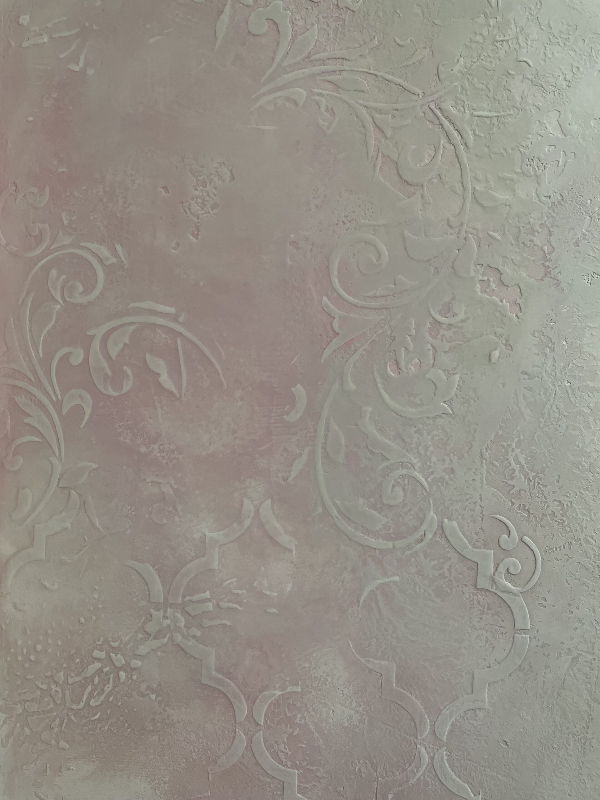 Előfordulnak olyan munkáim is, ahol színezett glettet használok, majd stencilekkel, mintázó hengerekkel vagy más formázó eszközökkel alakítom ki a végleges mintát és struktúrát.